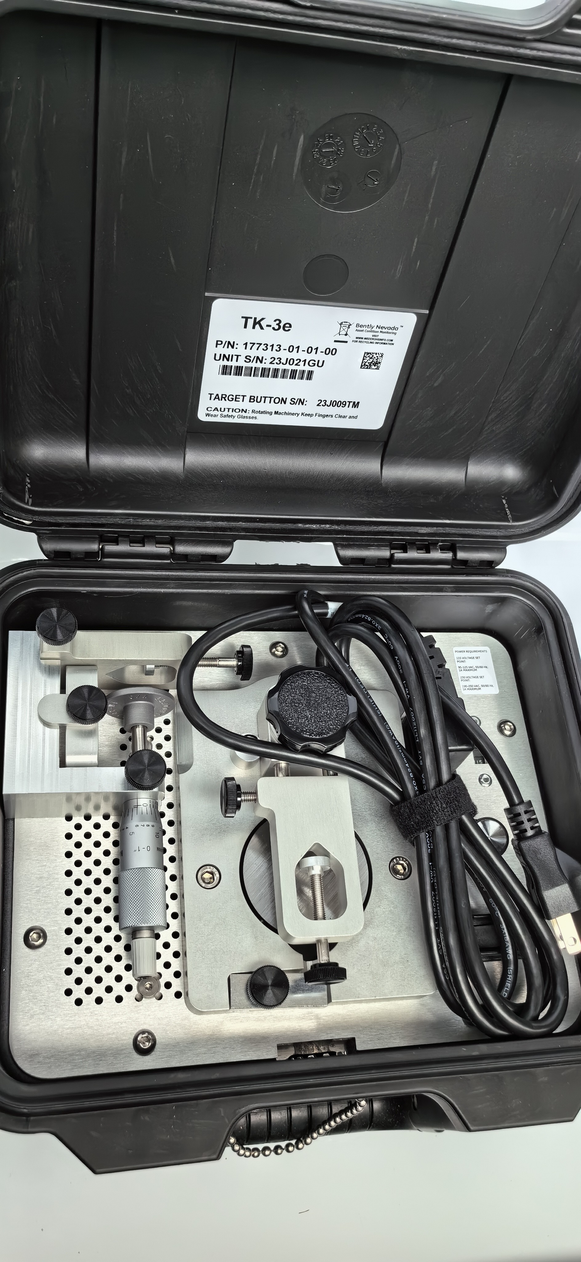 TK-3 menggunakan pemasangan spindle micrometer yang dapat dilepas untuk memeriksa sistem transduser dan kalibrasi monitor posisi.Perangkat ini dilengkapi dengan pemasangan probe universal yang akan menampung diameter probe dari 5 mm hingga 19 mm (0.197 in sampai 0.75 in).Mount memegang probe sementara pengguna bergerak target ke arah atau menjauh dari ujung probe dalam kalibrasi inkremen dan mencatat output dari Proximitor Sensor menggunakan voltmeter. Asosiasi spindle micrometer juga memiliki basis magnetik yang nyaman untuk kemudahan penggunaan di lapangan.